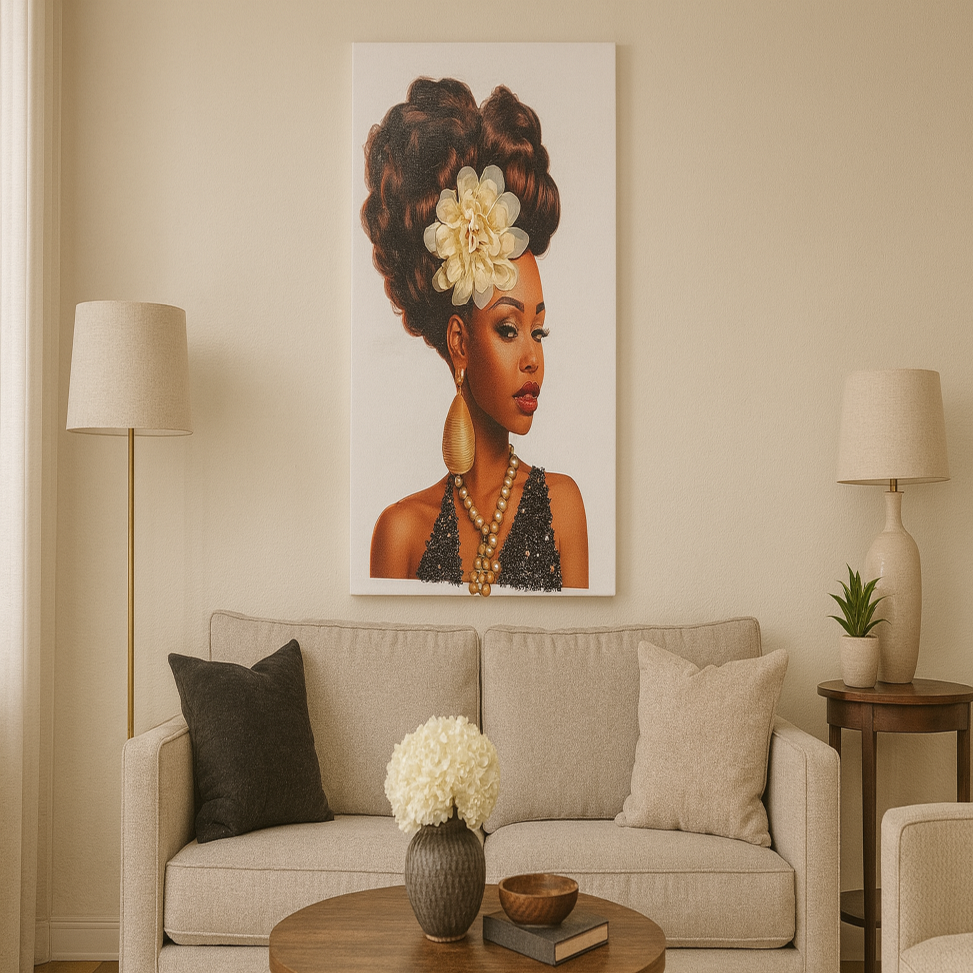 Infuse your space with elegance and empowerment through this striking 12x16 original canvas wall art. Showcasing a captivating portrait accented by a dramatic over-sized flower, this vibrant piece offers a unique blend of boldness and refined artistry and Empowered Essence.